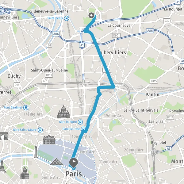 Turn right onto the cycleway Rue d'Aubervilliers and continue for 1.7 kilometer